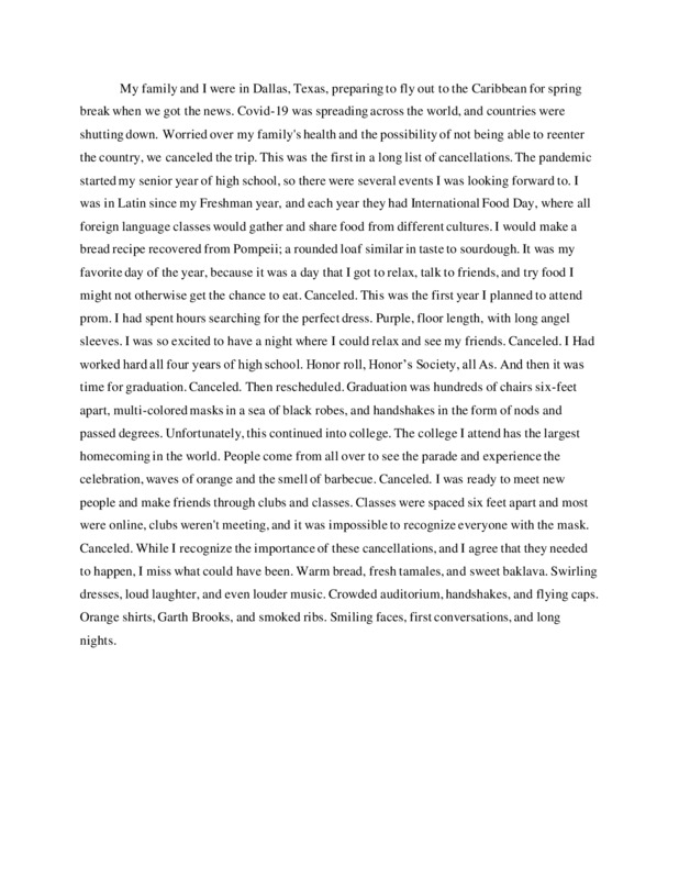 On the drive home my dad, who is a semi-prepper, was coming up with all sorts of scenarios and making plans for if the world collapsed but it honestly still felt like we were only entertaining ourselves. As we rolled back into my town, it looked like a beehive had exploded. People were driving crazy, every gas pump was full, and the Walmart was almost wiped out. That is when it started to sink in that things might be worse than I first thought. Then the first deaths started getting reported and it really seemed serious. I never went back to a high school classroom. My whole life changed from that point on. My first 2 years of college seemed almost fake and as of right now I have had COVID 3 times; the original, delta, and omicron. My family has also had it multiple times. We were some of the lucky ones to make it through with no lingering problems and for my older family members, with their lives. It is now April 2022 and things have finally started to go back to somewhat normal, but another wave could happen at any time. Corona Virus has changed our world and is going to be with us forever.
