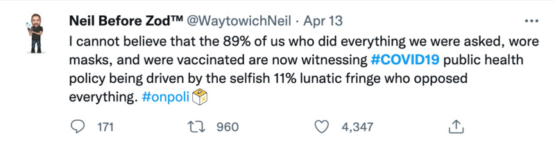 This is a Twitter update by WaytowichNeil. This user is ranting on what he calls the "selfish 11% lunatic fringe." To him, this fringe group is what is causing more problems with fighting COVID. In contrast, he says that 89% did everything they were asked. His frustration is coming from the belief that it is only the fringe deciding public health policy these days.