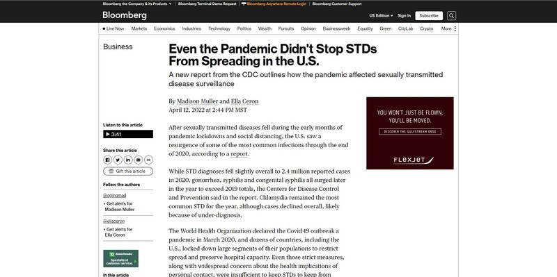 This is a news story from Bloomberg by Madison Muller and Ella Ceron. According to recent reports, the overall amount of STDs went down with the lockdowns in early 2020, but then started to rise again near the end of 2020. Gonorrhea, syphilis and congenital syphilis all surged later in the year to exceed 2019 totals, the Centers for Disease Control and Prevention said in the report. Chlamydia remained the most common STD for the year, although cases declined overall, likely because of under-diagnosis.