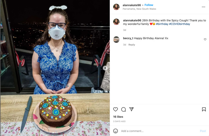 This is an Instagram post by alannakate96. This person is celebrating her 26th birthday while wearing a mask. She thanks her family for helping celebrate her day despite having a "spicy cough" as she calls it.