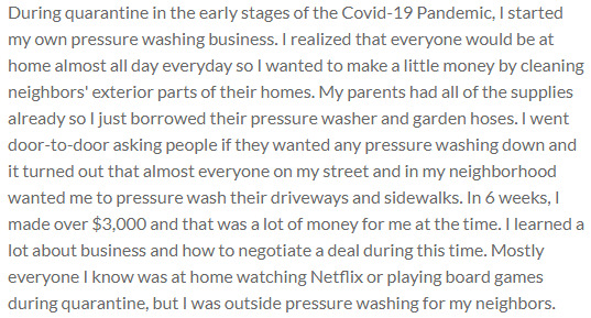 During quarantine in the early stages of the Covid-19 Pandemic, I started my own pressure washing business. I realized that everyone would be at home almost all day everyday so I wanted to make a little money by cleaning neighbors' exterior parts of their homes. My parents had all of the supplies already so I just borrowed their pressure washer and garden hoses. I went door-to-door asking people if they wanted any pressure washing down and it turned out that almost everyone on my street and in my neighborhood wanted me to pressure wash their driveways and sidewalks. In 6 weeks, I made over $3,000 and that was a lot of money for me at the time. I learned a lot about business and how to negotiate a deal during this time. Mostly everyone I know was at home watching Netflix or playing board games during quarantine, but I was outside pressure washing for my neighbors.