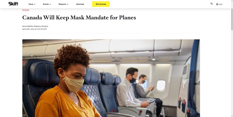 This is a news story from Skift by Anna Mehler Paperny. This says that Canada will keep the mask mandate for planes. The Canadian government said it has no plans to lift the mask mandate after a US federal judge in Florida struck down the mask mandate for planes. Canada's spokesperson for the Transportation Minister wrote in an email that “We are taking a layered approach to keeping travelers safe, and masks remain an incredibly useful tool in our arsenal against Covid-19."'
