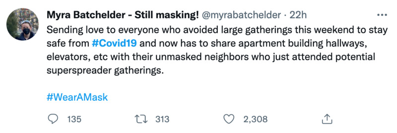 This is a Twitter update by myrabatchelder. This woman is saying how grateful she was for people that avoided large gatherings this year for Easter, yet is being made to share space with unmasked neighbors going to big events.