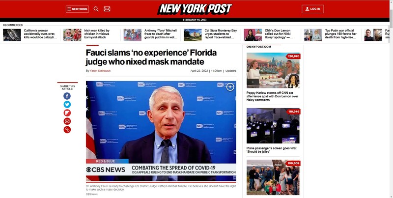 This is a news story from the New York Post by Yaron Steinbuch. Dr. Anthony Fauci has went against what the Florida judge has said against the mask mandate. He says that she does not know enough about health to make a decision.