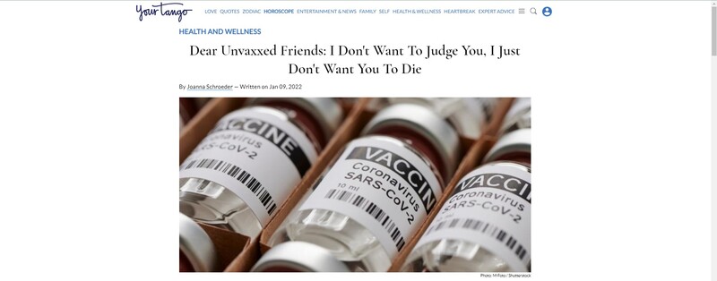 This is a text story by YourTango, written by Joanna Schroeder. This is a story written from the point-of-view by someone that wants others to be vaccinated. At the beginning, she brings up the feelings of distrust some have towards the government, which has been a big reason why some are refusing to get vaccinated. The author then mentions that she has been seeing an increase in patients with heart problems in the pediatric section of hospitals, with some of those cases being due to COVID. Continuing on with this point, the author mentions a peds cardiologist she has been in contact with, and the cardiologist says that there has been an increase in myocarditis cases due to COVID. Later, she says that her left-leaning friends are receptive to data like this, but her right-leaning friends are not. She then pleads that she does not want her unvaccinated friends to die, and that they have a greater chance of getting hospitalized compared to those that are vaccinated. Finally, she ends by saying to not let policies get in the way of good judgement, saying that she is tired of misinformation coming from both sides.