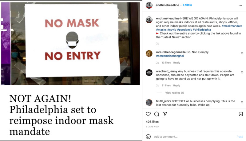 This is an Instagram story by endtimeheadline. This is about Philadelphia bringing back the mask mandate, which will have masks be required again at restaurants, shops, offices, and other indoor public spaces.