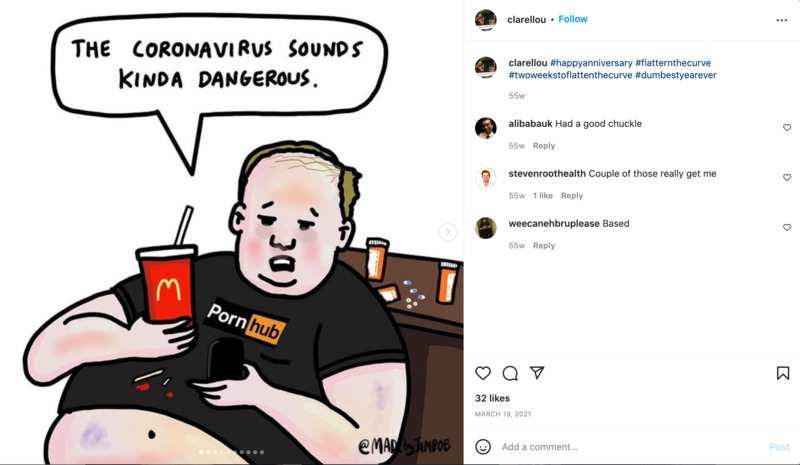 This is an Instagram post by clarellou. The post is of a comic showing a man with unhealthy habits calling the coronavirus dangerous. This is supposed to be criticism of people not taking care of their own health, while being fearful of something less deadly than being obese or a drug abuser.