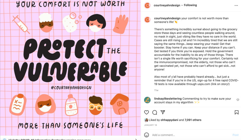 This is an Instagram post by courtneyahndesign. This is an Instagram post critiquing people's lack of care for others during the pandemic. She thinks it is ridiculous that people are already going places maskless and being careless with how much they expose themselves. At the end, she recommends for people to go and get tested.
