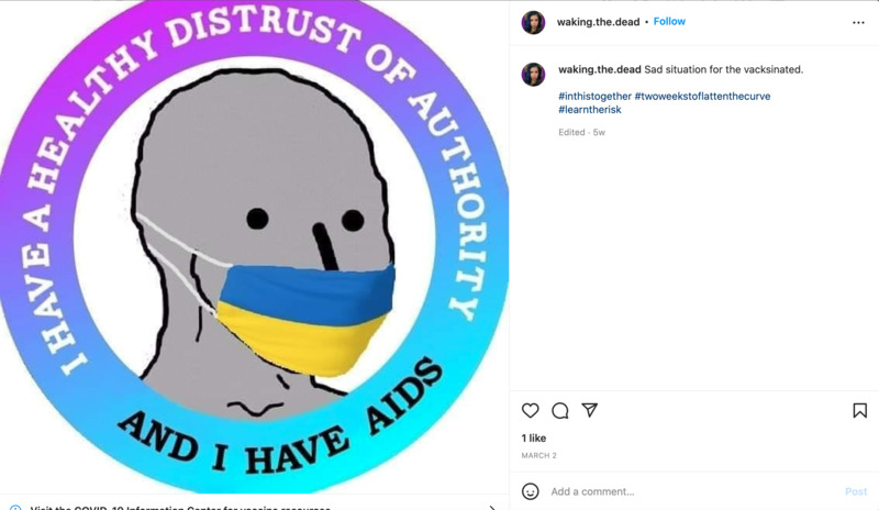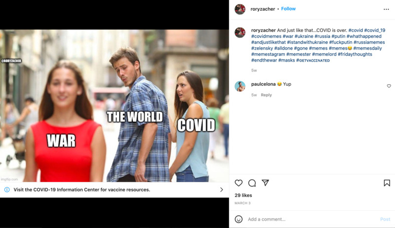 This is an Instagram post by roryzacher. This is a meme showing what they think about the virus. This is a popular meme of a guy looking back at a girl in red, with his angry girlfriend in blue to the side of him. This meme became popular in the mid-2010s and has retained its popularity. In this context, it means now that there is a war, the COVID narrative is gone. This is commonly used by pandemic skeptics since they believe many of the COVID restrictions were more political rather than for health reasons. The war this is referencing is the Russian invasion on Ukraine.