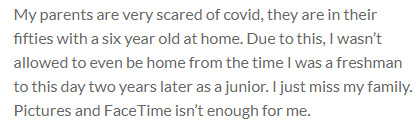 My parents are very scared of covid, they are in their fifties with a six year old at home. Due to this, I wasn’t allowed to even be home from the time I was a freshman to this day two years later as a junior. I just miss my family. Pictures and FaceTime isn’t enough for me.