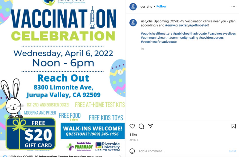 This is an Instagram post by ucr_chc. This is of a celebration where kids are encouraged to go and get vaccinated. The celebration flyer says that there will be food and kids toys available. The event is also giving away free testing kits, and will do booster shots as well. This event was held in Jurupa Valley, California.