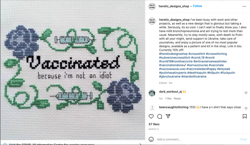 This is an Instagram post by heretic_designs_shop. This is a cross stitch of an opinion on the vaccines. Since the vaccines have become available, people have been making and selling merchandise with how they feel about the vaccines. The person that owns this shop says that this design is available for purchase.