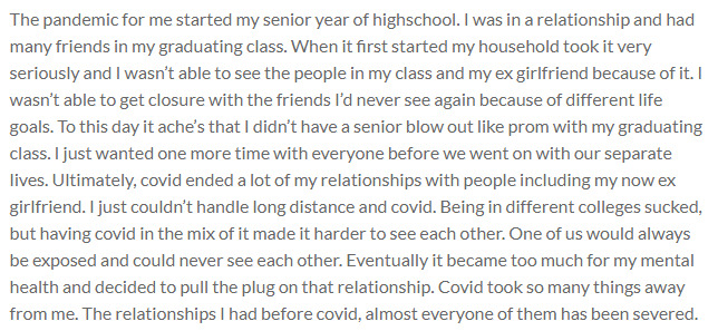 The pandemic for me started my senior year of highschool. I was in a relationship and had many friends in my graduating class. When it first started my household took it very seriously and I wasn’t able to see the people in my class and my ex girlfriend because of it. I wasn’t able to get closure with the friends I’d never see again because of different life goals. To this day it ache’s that I didn’t have a senior blow out like prom with my graduating class. I just wanted one more time with everyone before we went on with our separate lives. Ultimately, covid ended a lot of my relationships with people including my now ex girlfriend. I just couldn’t handle long distance and covid. Being in different colleges sucked, but having covid in the mix of it made it harder to see each other. One of us would always be exposed and could never see each other. Eventually it became too much for my mental health and decided to pull the plug on that relationship. Covid took so many things away from me. The relationships I had before covid, almost everyone of them has been severed.