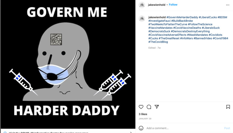 This is an Instagram post by jakewienhold. The picture posted by this user shows an NPC accepting all the COVID restrictions. The NPC is the grey character. The NPC itself is a meme that got popular in the late 2010s and has continued to have popularity into the 2020s. NPC stands for "Non Playable Character." The term has its origins in gaming where characters that have a pre-written script and can't go beyond that are an "NPC." This term has gone beyond gaming and has been used to refer to people of any political stripe as an NPC as an insult. It insinuates that people who would follow herd mentality for any cause have no thoughts of their own, like an NPC in a video game.
