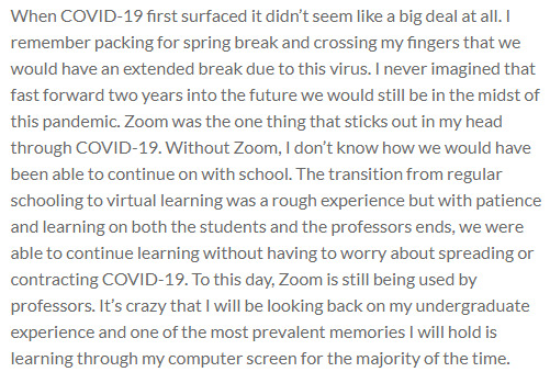 When COVID-19 first surfaced it didn’t seem like a big deal at all. I remember packing for spring break and crossing my fingers that we would have an extended break due to this virus. I never imagined that fast forward two years into the future we would still be in the midst of this pandemic. Zoom was the one thing that sticks out in my head through COVID-19. Without Zoom, I don’t know how we would have been able to continue on with school. The transition from regular schooling to virtual learning was a rough experience but with patience and learning on both the students and the professors ends, we were able to continue learning without having to worry about spreading or contracting COVID-19. To this day, Zoom is still being used by professors. It’s crazy that I will be looking back on my undergraduate experience and one of the most prevalent memories I will hold is learning through my computer screen for the majority of the time.