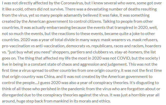 I was not directly affected by the Coronavirus, but I knew several who were, some got over it like a cold, others did not survive. There was a devastating number of deaths resulting from the virus, yet so many people adamantly believed it was fake, it was something created by the American government to control citizens. Talking to people from other countries, it was actually embarrassing because the events that transpired in 2020, well, not so much the events, but the reactions to these events, became quite a joke to other countries. 2020 was a year of total divide in many ways: mask wearers vs. mask refusers, pro-vaccination vs anti-vaccination, democrats vs. republicans, races and racism, hoarders vs. "just buy what you need" shoppers, partiers and clubbers vs. stay-at-homers, the list goes on. The thing that affected my life the most in 2020 was not COVID, but the society I live in being in a constant state of chaos and aggression and judgement. This was not the first time a virus spread to other countries from one origin country, it was not the first time that origin country was China, and it was not created by the American government to control the people....I guess 2020 was also a year of conspiracy theories. It's disgusting to think of all those who perished in the pandemic from the virus who are forgotten about or disregarded due to the conspiracy theories against the virus. It was just a horrible year all around, huge step back from mankind in its morals and ethics.