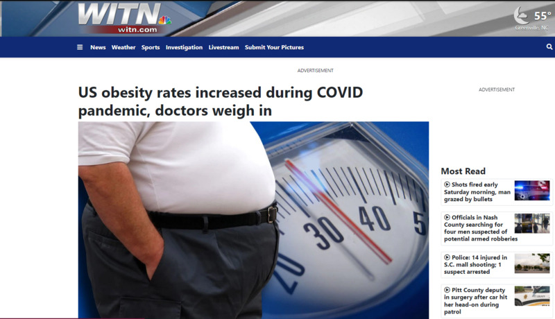 This is a text story from WITN by Justin Lundy. This is a news story on the increase in obesity rates since COVID started. In a study published by the American Journal of Preventative Medicine, the average BMI in US adults increased by 0.6% between March 2020 and March 2021. This increase happened even as exercise participation rates increased by 4.4%.