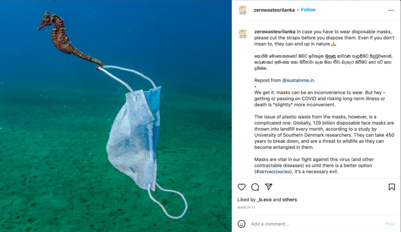 This is an Instagram post by zerowastesrilanka. This is a post advising people to cut the straps off of the mask before disposing of them because it can hurt ocean life. This is one major issue with mask mandates, since disposable masks are the most commonly worn. Having a buildup of too many masks places can hurt the environment, so this group is looking to let people know of how to properly dispose of a mask.