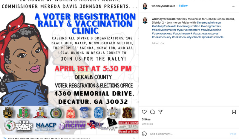 This is an Instagram post by whitneyfordekalb. This is an advertisement for people to attend a voter registration and vaccine clinic. It is calling on a few Black organizations in addition to unions to join the rally. Below are a few sponsors of the event. This event is in Georgia.