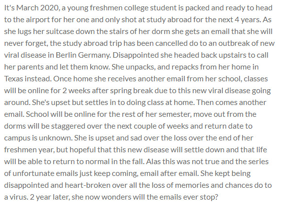 It's March 2020, a young freshmen college student is packed and ready to head to the airport for her one and only shot at study abroad for the next 4 years. As she lugs her suitcase down the stairs of her dorm she gets an email that she will never forget, the study abroad trip has been cancelled do to an outbreak of new viral disease in Berlin Germany. Disappointed she headed back upstairs to call her parents and let them know. She unpacks, and repacks from her home in Texas instead. Once home she receives another email from her school, classes will be online for 2 weeks after spring break due to this new viral disease going around. She's upset but settles in to doing class at home. Then comes another email. School will be online for the rest of her semester, move out from the dorms will be staggered over the next couple of weeks and return date to campus is unknown. She is upset and sad over the loss over the end of her freshmen year, but hopeful that this new disease will settle down and that life will be able to return to normal in the fall. Alas this was not true and the series of unfortunate emails just keep coming, email after email. She kept being disappointed and heart-broken over all the loss of memories and chances do to a virus. 2 year later, she now wonders will the emails ever stop?