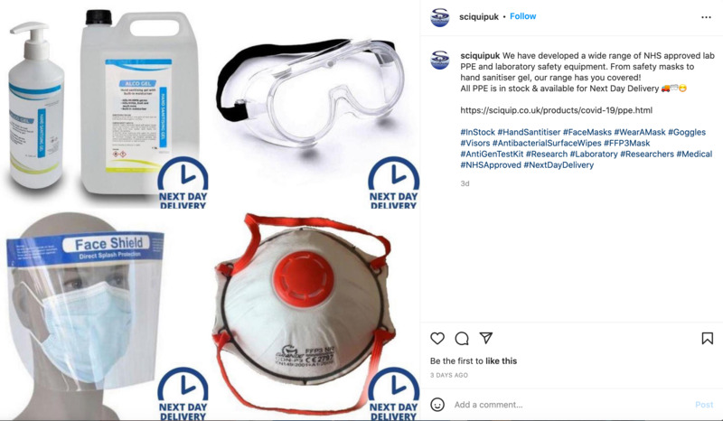 This is an Instagram post by sciquipuk. This is a store that sells NHS approved PPE for people to buy. Throughout the pandemic, I have seen people use a variety of these items. I have mostly seen masks. Every once in a while, I have seen people use face shields. This is a good post that demonstrates some of the things people have regularly worn during the course of the pandemic.