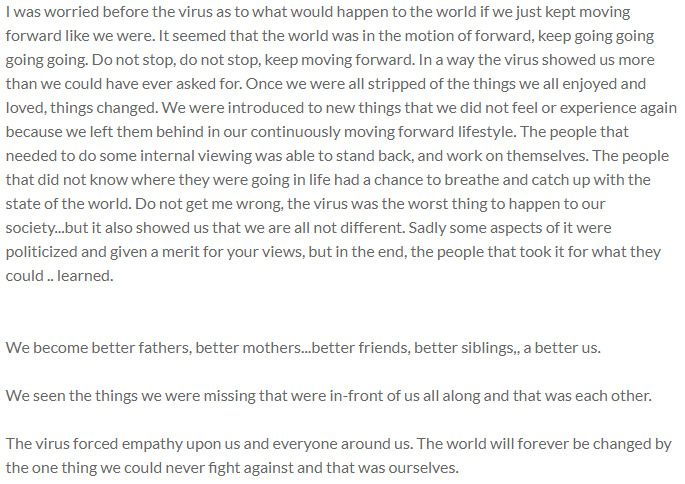 I was worried before the virus as to what would happen to the world if we just kept moving forward like we were. It seemed that the world was in the motion of forward, keep going going going going. Do not stop, do not stop, keep moving forward. In a way the virus showed us more than we could have ever asked for. Once we were all stripped of the things we all enjoyed and loved, things changed. We were introduced to new things that we did not feel or experience again because we left them behind in our continuously moving forward lifestyle. The people that needed to do some internal viewing was able to stand back, and work on themselves. The people that did not know where they were going in life had a chance to breathe and catch up with the state of the world. Do not get me wrong, the virus was the worst thing to happen to our society...but it also showed us that we are all not different. Sadly some aspects of it were politicized and given a merit for your views, but in the end, the people that took it for what they could .. learned.