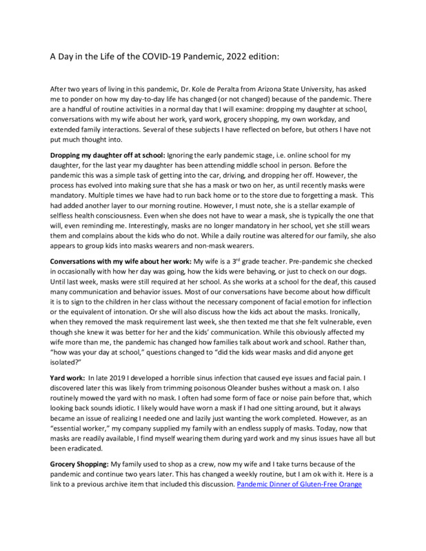 After two years of living in this pandemic, Dr. Kole de Peralta from Arizona State University, has asked me to ponder on how my day-to-day life has changed (or not changed) because of the pandemic. There are a handful of routine activities in a normal day that I will examine: dropping my daughter at school, conversations with my wife about her work, yard work, grocery shopping, my own workday, and extended family interactions. Several of these subjects I have reflected on before, but others I have not put much thought into.