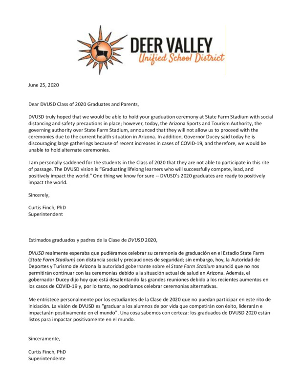 This letter is written by Dr. Curtis Finch, the Superintendent of Deer Valley Unified School District, one of the largest school districts in Arizona. The letter is addressed to the 2020 class of DVUSD high school graduates and their parents. Dr. Finch explains that graduation (which had already been postponed by a month) would need to be canceled due to new laws and policies. The letter ends with an encouraging note.