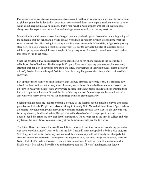 Since the pandemic relegated many people to quarantining and spending more time at home, working and going to school virtually, I have noticed that I am not as social as I used to be. While I’ve never been a very sociable person, I’ve noticed that, not only do I not crave social interaction outside of my family and close friends as much as I used to, I have to “prepare” myself for social gatherings and interactions. I have more social anxiety than I ever thought I would and going to events where I may have to hold long conversations revolving around “small talk” make me anxious and tired. I hope that I am able to work through this over time as things become more open and social gatherings and events become more common, but it is another way in which the pandemic has affected me most.