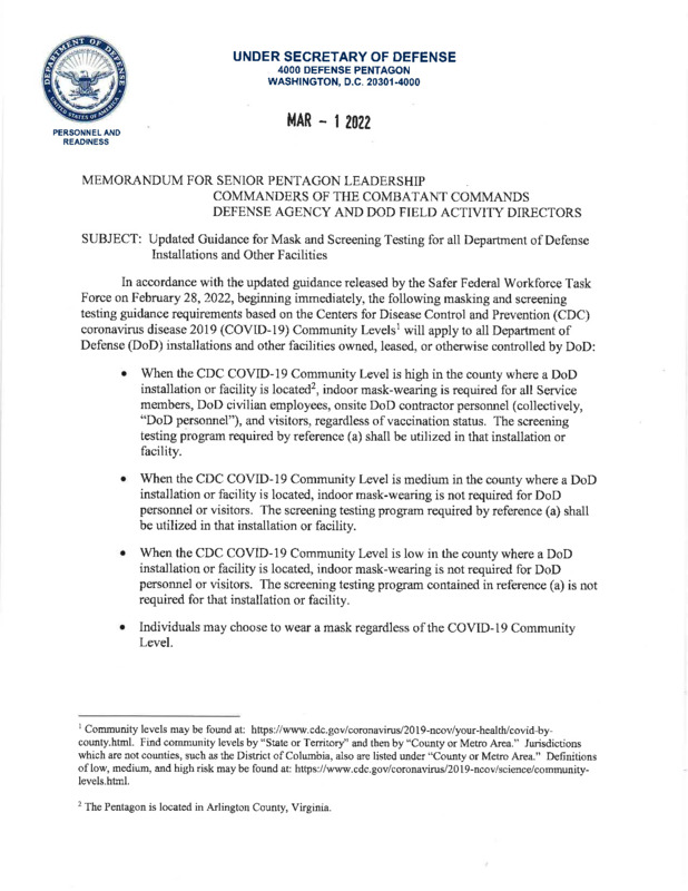 The attached is a memorandum for record from the Under Secretary of Defense. This memo was published 1 March 2022 and was a big deal for us in the military and really everyone who works on military installations or in other Department of Defense facilities. Prior to this memo, we were all required to wear face coverings at all times when in doors, regardless of local state or county guidance. This memo was a great policy move as it changed the requirement from an overarching blanket policy to instead replicate local community guidance. I can tell you, we were very relieved to not be required to wear a face covering at all times. unlike many other sectors across the US, many military members did not have the opportunity to work from home during the pandemic. This is just due to the nature of our jobs, therefore we were masked up for a long time, even in places such as Texas and Florida where masks were no longer required according to local state and county guidance.