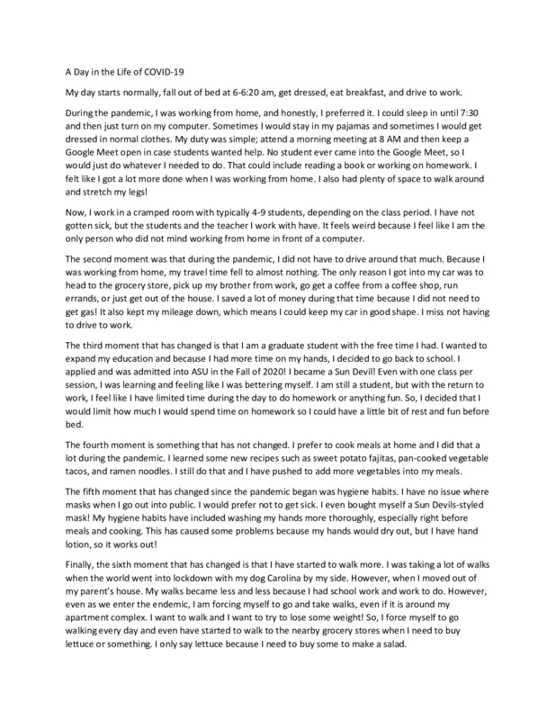 I am submitting my Day in the Life of COVID. This document shows how the aspects of my life have or have not changed. My life has changed a lot when we were put into lockdown, but it also changed again when I returned to working in person. Yet, work is not the only thing that has changed. I would like to think some of the changes I have discussed will inspire some positivity in my life and others' lives. I think that it would be good to add some more positive stories to the archive.
