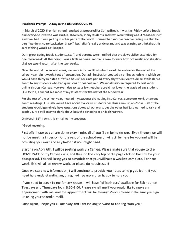 I described how ending the school year during COVID-19 was. I am a high school teacher, and we went on Spring Break and never came back. I include an e-mail I sent to my students.
