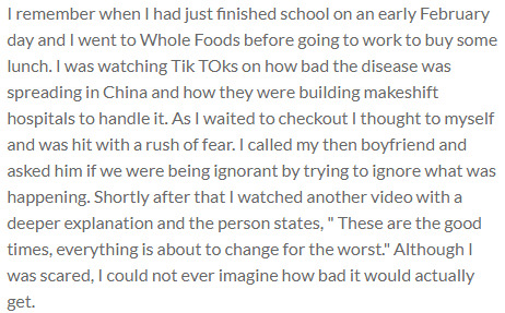 I remember when I had just finished school on an early February day and I went to Whole Foods before going to work to buy some lunch. I was watching Tik TOks on how bad the disease was spreading in China and how they were building makeshift hospitals to handle it. As I waited to checkout I thought to myself and was hit with a rush of fear. I called my then boyfriend and asked him if we were being ignorant by trying to ignore what was happening. Shortly after that I watched another video with a deeper explanation and the person states, " These are the good times, everything is about to change for the worst." Although I was scared, I could not ever imagine how bad it would actually get.