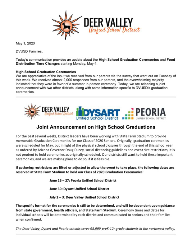 On May 1st, Dr. Curtis Finch, the Superintendent of Deer Valley Unified School District (one of the largest districts in Arizona), sent a letter as part of a daily update during the end of the 2019-2020 school year. Due to laws and regulations, there were many people unsure about whether the Class of 2020 would have a graduation ceremony. In this letter, Dr. Finch announced that an in-person ceremony would be held during the summer (July 2-3) due to a survey where the majority of parents indicated that they wanted an in-person ceremony.