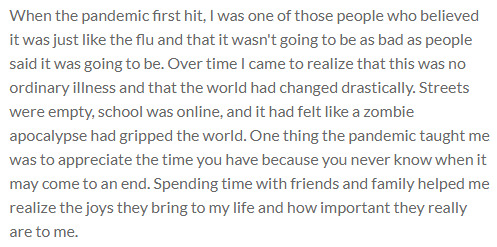When the pandemic first hit, I was one of those people who believed it was just like the flu and that it wasn't going to be as bad as people said it was going to be. Over time I came to realize that this was no ordinary illness and that the world had changed drastically. Streets were empty, school was online, and it had felt like a zombie apocalypse had gripped the world. One thing the pandemic taught me was to appreciate the time you have because you never know when it may come to an end. Spending time with friends and family helped me realize the joys they bring to my life and how important they really are to me.
