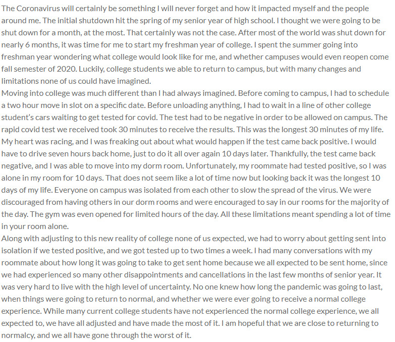 Along with adjusting to this new reality of college none of us expected, we had to worry about getting sent into isolation if we tested positive, and we got tested up to two times a week. I had many conversations with my roommate about how long it was going to take to get sent home because we all expected to be sent home, since we had experienced so many other disappointments and cancellations in the last few months of senior year. It was very hard to live with the high level of uncertainty. No one knew how long the pandemic was going to last, when things were going to return to normal, and whether we were ever going to receive a normal college experience. While many current college students have not experienced the normal college experience, we all expected to, we have all adjusted and have made the most of it. I am hopeful that we are close to returning to normalcy, and we all have gone through the worst of it.