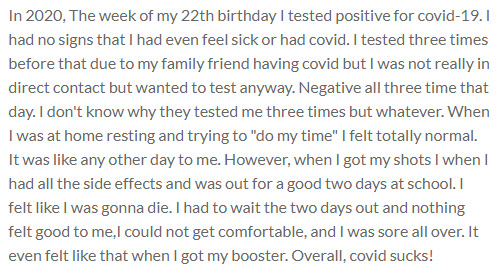 In 2020, The week of my 22th birthday I tested positive for covid-19. I had no signs that I had even feel sick or had covid. I tested three times before that due to my family friend having covid but I was not really in direct contact but wanted to test anyway. Negative all three time that day. I don't know why they tested me three times but whatever. When I was at home resting and trying to "do my time" I felt totally normal. It was like any other day to me. However, when I got my shots I when I had all the side effects and was out for a good two days at school. I felt like I was gonna die. I had to wait the two days out and nothing felt good to me,I could not get comfortable, and I was sore all over. It even felt like that when I got my booster. Overall, covid sucks!