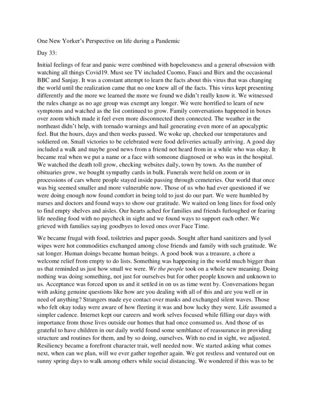 In this interview conducted by Christina Lefebvre, Dr Caroline Birks Brown describes the drastic changes she saw while working in a hospital. She discusses patient care, the hospitals rapid response to converting floors to ICUs, and the way the hospital delt with staffing enough nurses to provide sufficient care to patients. She discusses how Spanish speaking doctors and nurses were asked to volunteer to work to avoid depersonalization and how other branches, like social workers, stepped up to provide the best care possible under the circumstances. Dr Caroline also touches on the possibility of young people getting covid and her thoughts on the patterns of the groups of people getting sick. She reenforces her appreciation of nurses and also discusses the politicization of the virus. The interview ends with her thoughts on what could have been done differently, politically and socially, to control the spread of the virus. As a mother, she talks about distanced learning and its effects on children and the importance of socialization. The last topic is about lessons she hopes we have learned.