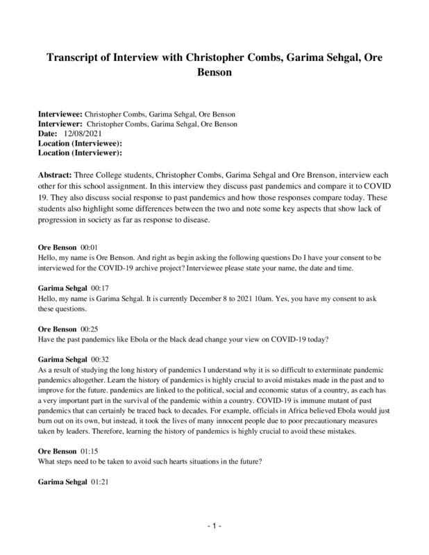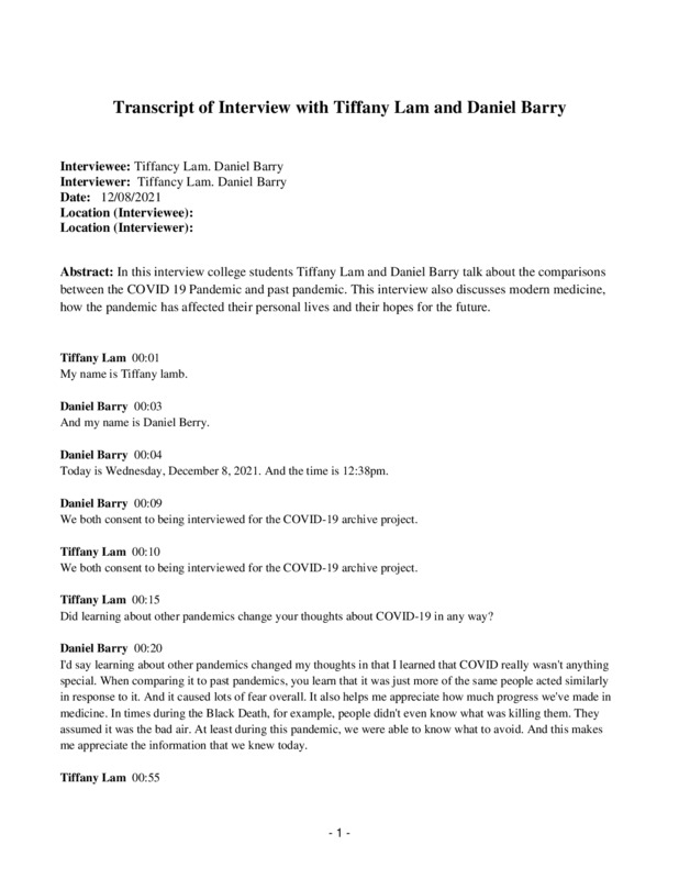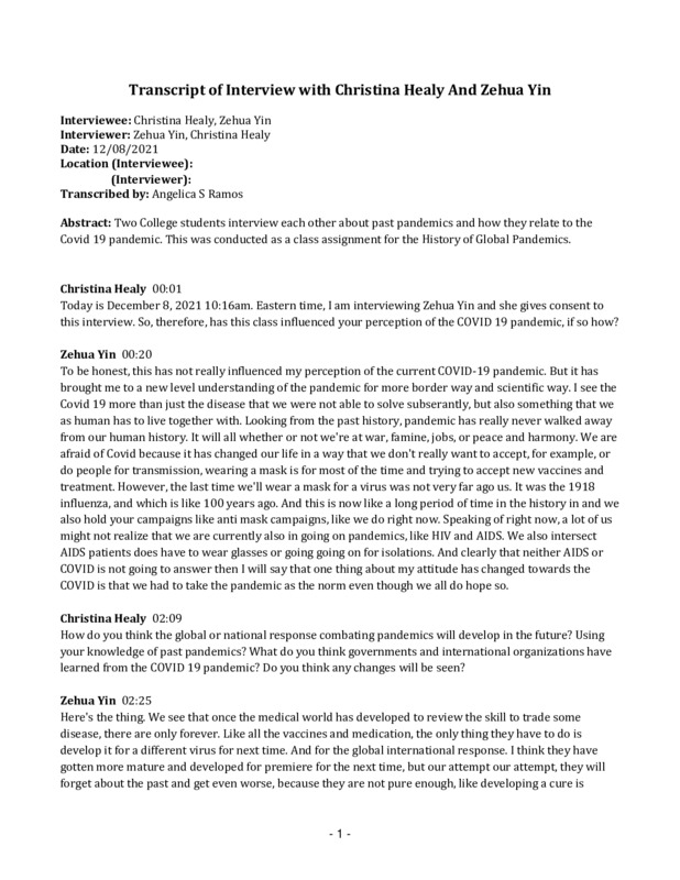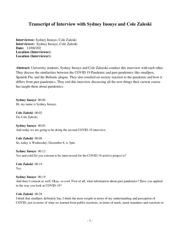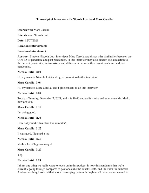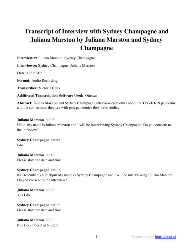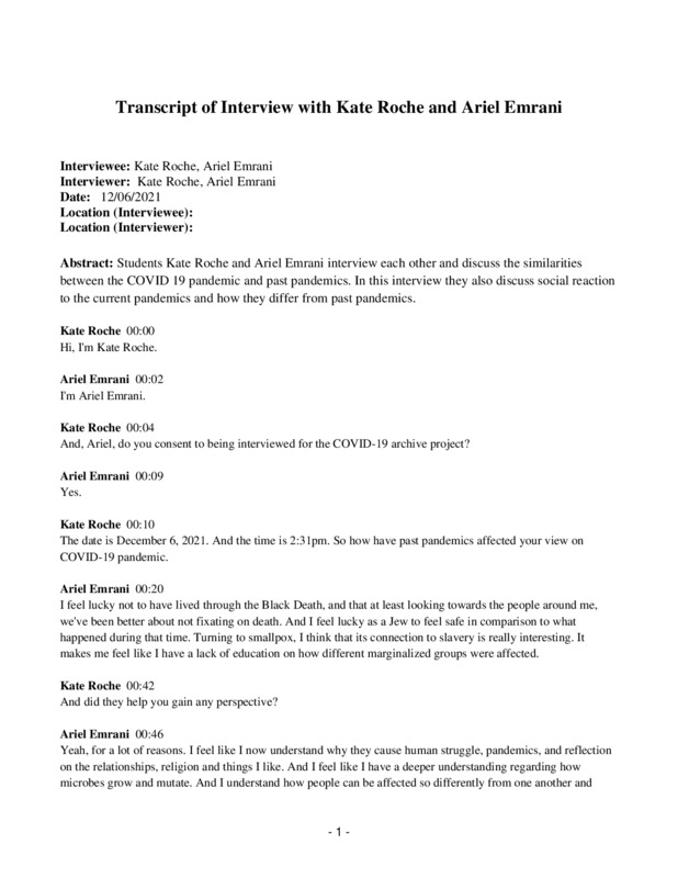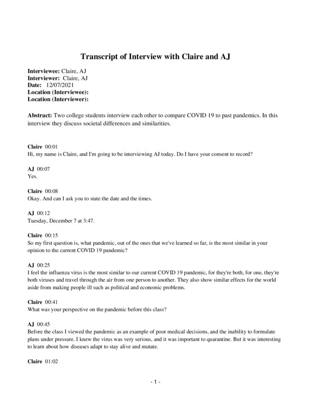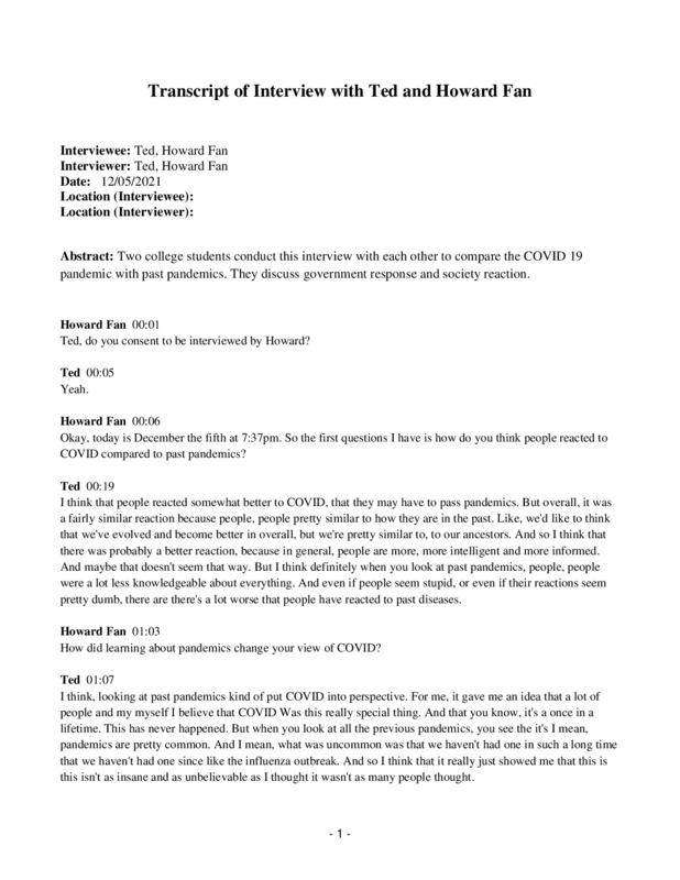 Two college students conduct this interview with each other to compare the COVID 19 pandemic with past pandemics. They discuss government response and society reaction.