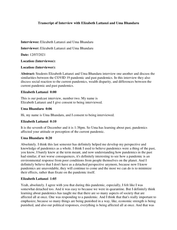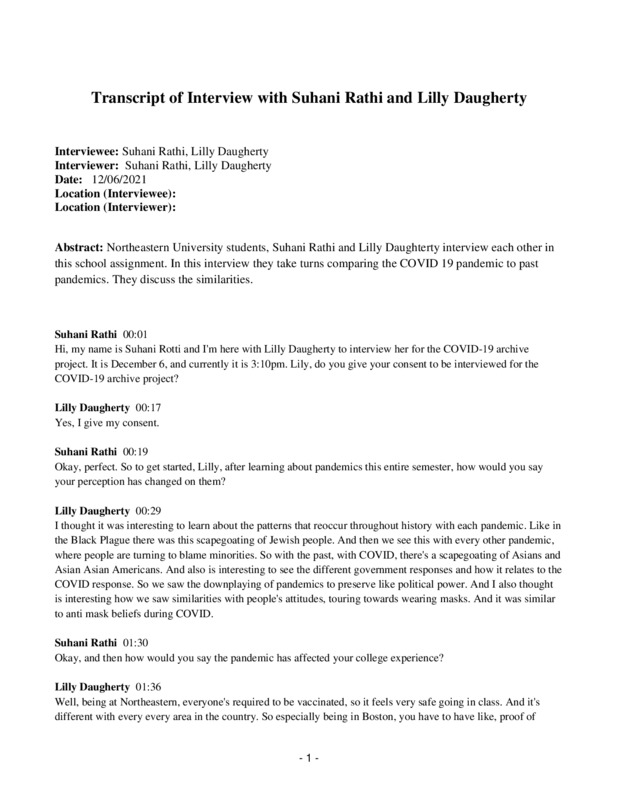 Northeastern University students, Suhani Rathi and Lilly Daughterty interview each other in this school assignment. In this interview they take turns comparing the COVID 19 pandemic to past pandemics. They discuss the similarities.