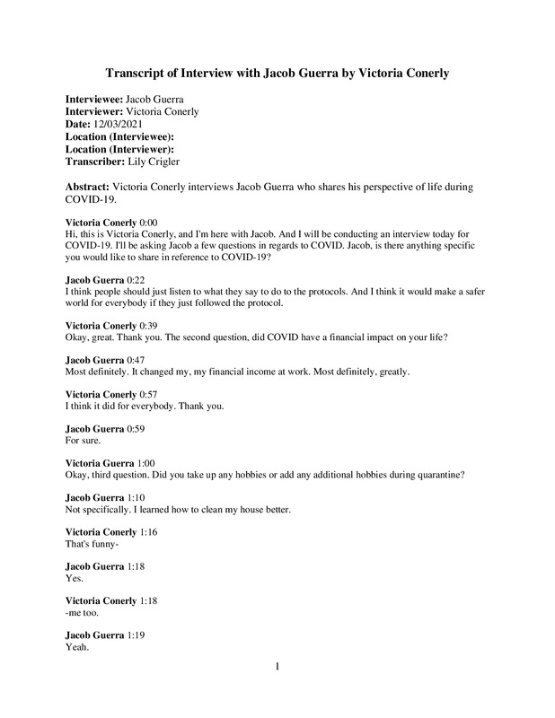 I conducted an interview with Jacob Guerra. It was my pleasure listening to his perspective and learning more about his insight in reference to COVID 19.