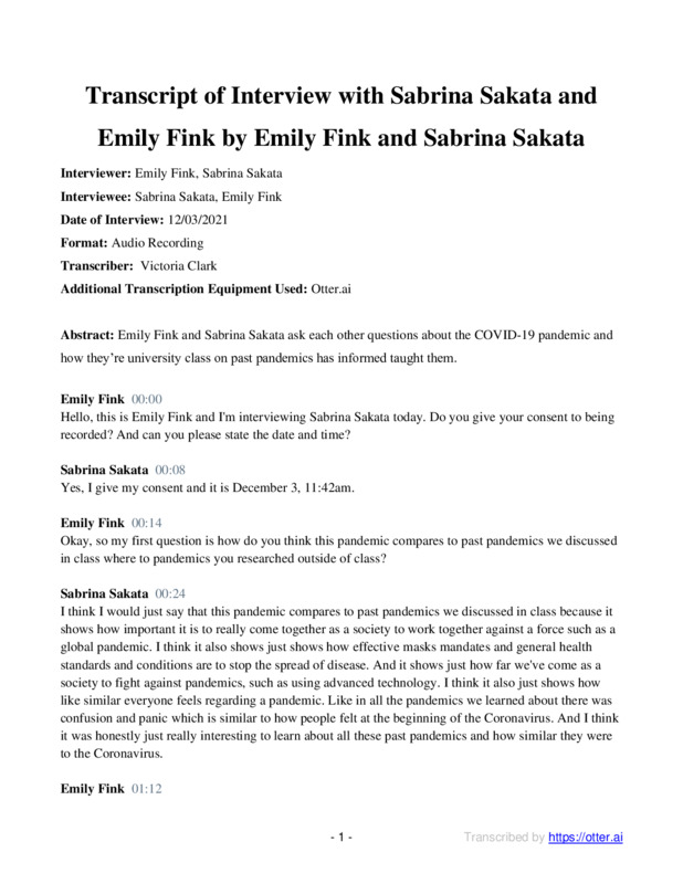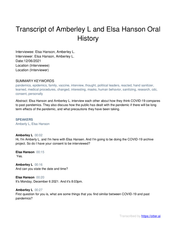 Elsa Hanson and Amberley L. interview each other about how they think COVID-19 compares to past pandemics. They also discuss how the public has dealt with the pandemic if there will be long term effects of the pandemic, and what precautions they have been taking.