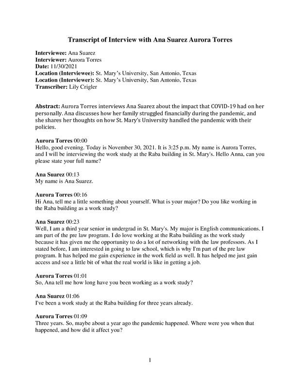 I interviewed a student that attends St. Mary’s University and is a work study in the Law School. I wanted to get her voice out and get an idea of what her perspective was on this ongoing pandemic. Hearing her and speak about where she was when the pandemic struck really reminded me that we all faced the same problems and that no one knew what the outcome was going to be. As a student in college, I’m sure that it was just as hard to know that schools would be shutting down and having no clue as to what the next step would be. Going back home and attending class virtue was hard especially if some did not have the resources for online fees, or laptops, etc. Hearing from Ana, and knowing that she struggled financially while in quarantine and making ends meet really makes us think that everyone had it hard. But in the long run she was able to go back to school and received the vaccination and made sure she followed all the policies that were in effect at the University. At least make it feel like some things were back to normal.
