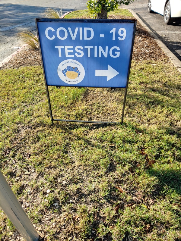 The photograph is of a sign that says COVID testing and has an arrow that points to the right. it also says that masks are required. there is also the hashtag coveryourfangs, it is from the St. Mary's University in San Antonio, Texas.