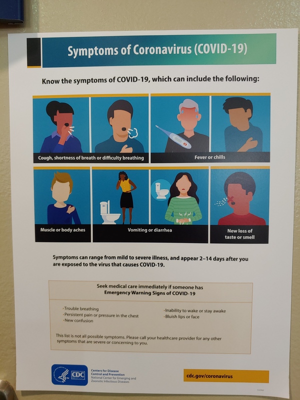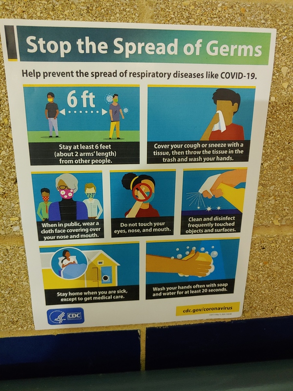 The photo is a CDC poster that describes safe practices during the pandemic. These include: social distancing, covering mouth and nose with coughing/sneezing, mask wear, not touching your face, clean and disinfect surfaces and to stay home when sick.