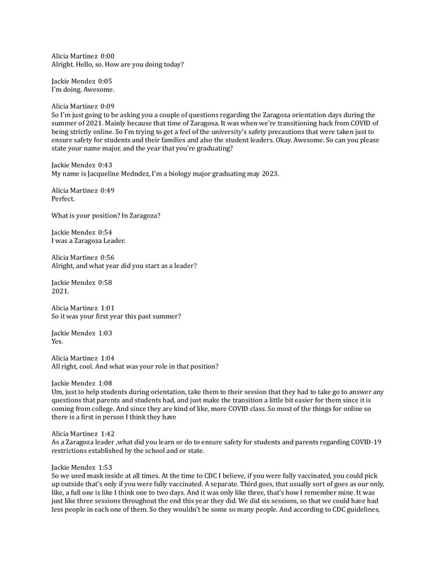 This is an interview with Zaragoza Leader Jacqueline Mendez about her experience as a student orientation leader during the summer of 2021. She describes her role as a Zaragoza leader and how her student orientation experience prior to the pandemic differed from those of her students during the summer with COVID-19.