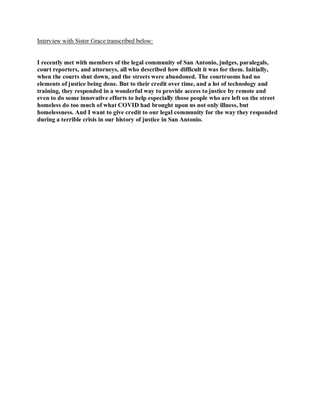 This is an excerpt from a video interview with Sister Grace that I and another student in my class did for a work project. Sister Grace is the Chaplin of the Law School at St. Mary’s University. Sister Grace graduated from St. Mary’s 1978 and worked in the undergrad Ministry and by 1993-94 in Law Ministry. Sister Grace has enjoyed watching students grow and succeed to becoming great people for the community. I used this excerpt because Sister Grace is someone who helps out the students and community and during the pandemic, she met a lot of people that ere going through hard times. Her and the church got together to help distribute food and clothing to the homeless, or whoever needed aid during the pandemic. She wanted to make sure everyone in the community was taken care of. Also, she even talks about how she got plenty of time to do more things during quarantine.