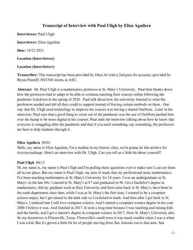 I strongly believe that every perspective matters. We as students do not see what professors had to go through. We were aware of the situation, but I believe an interview with a professor from St. Mary’s University could help students to see the magnitude of the pandemic. COVID-19 affected all of us and that is why I think we should see everyone’s perspective and that includes the professor’s perspective. We can see Dr. Uhlig’s point of view with this interview and how the pandemic affected his profession.