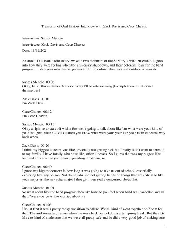 This is an audio interview with two members of the St Marys wind ensemble. It goes into how they were feeling when the university shut down, and their potential fears for the band program. It also goes into their experiences during online rehearsals and outdoor rehearsals.