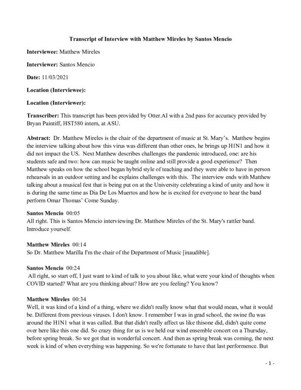 This is an audio interview with Dr. Matthew Mireles, the St Marys Music Department Chair. It goes into the challenges he faced managing the music department, what he was feeling throughout COVID. It also goes into what his priorities were after the initial lockdowns and what his main goals were when it came to getting the band program back to normal.